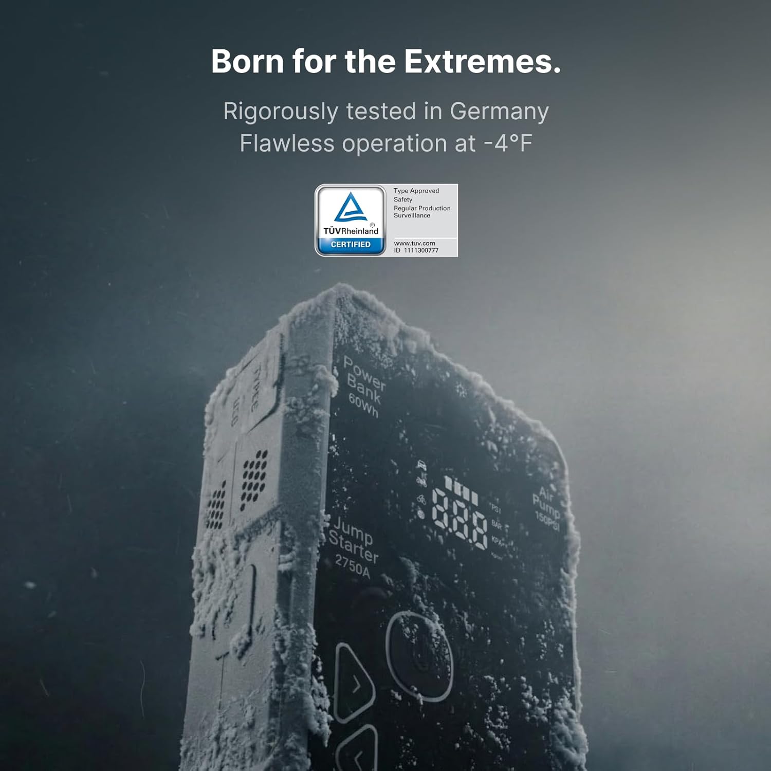 • [TÜV CERTIFIED: AUTOMOTIVE-GRADE DURABILITY] The first portable car jump starter to pass rigorous German TÜV testing standards. Engineered with 30%+ hardware redundancy, fire-resistant shells, and an in-house automotive-grade battery for unmatched reliability. It performs flawlessly in -30°C freezing extremes.