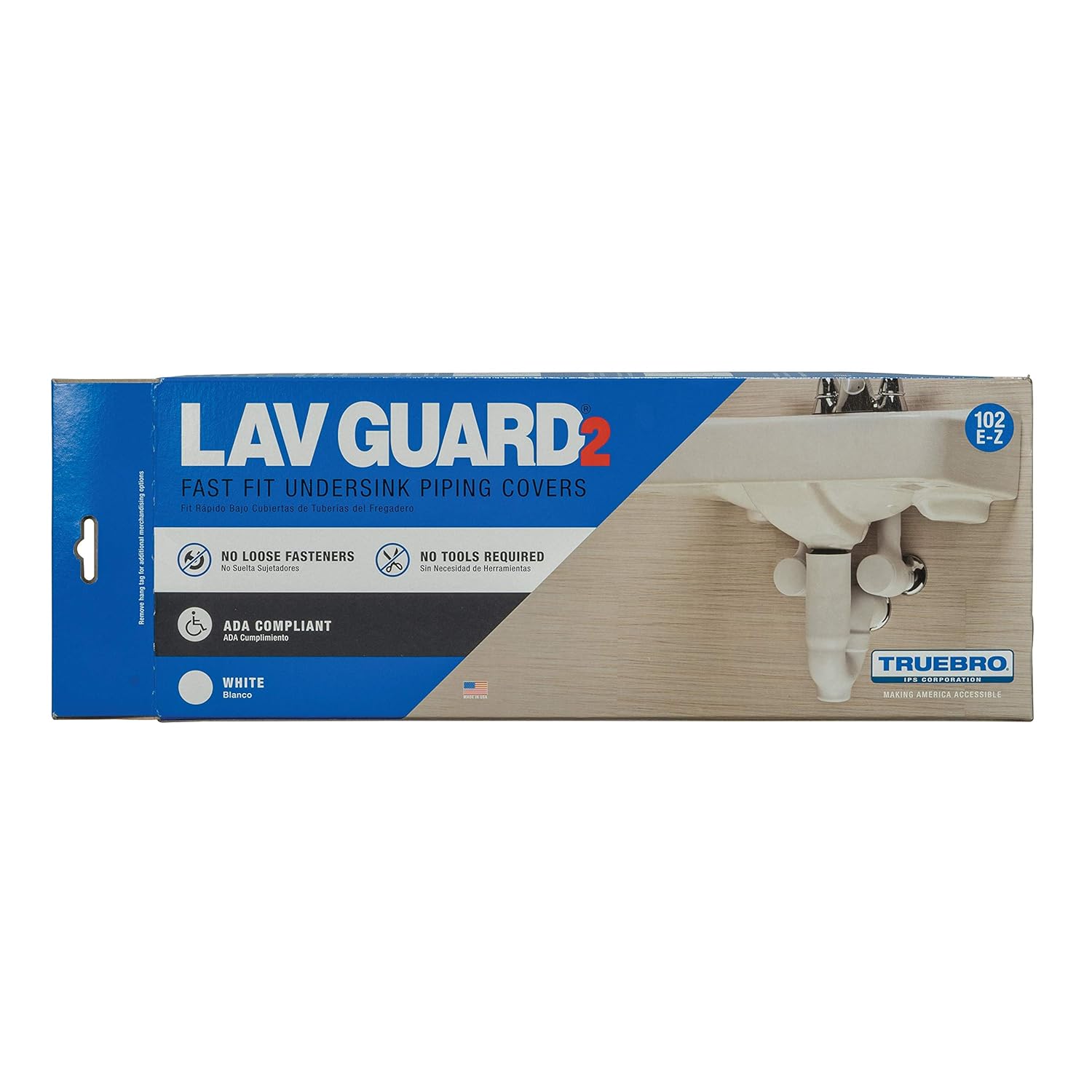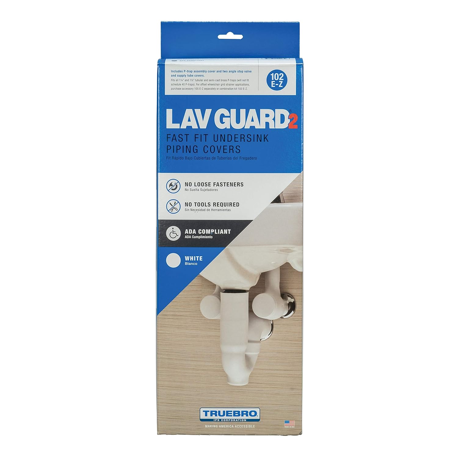 The Truebro brand has been dedicated to "Making America Accessible" by creating products that address ADA-mandated undersink accessibility. Lav Guard 2 E-Z 100 series provides the durable, attractive, ADA compliant undersink protection that the original Truebro Lav Guard is famous for. Built-in E-Z Grip fasteners and internal E-Z Tear-To-Fit trimming features eliminate the need for tools, and provide for a clean, tamper-resistant, super-fast professional installation. Lav Guard 2 can be installed over cast brass or tubular P-trap assemblies and angle stop assemblies. Lav Guard 2 provides a professional and quick-to-install ADA compliant solution for all public lavatories. Truebro Lav Guard 2 100 Series P-Trap Cover with 2 Angle Valve and Supply Cover, Nominal Wall Size: 1/8 Inch, Durometer: 70 - 80 Shore A, For Use With: 1-1/4 or 1-1/2 Inch Cast Brass or Tubular P-Trap Assemblies and 3/8 or 1/2 Inch Angle Stop Assemblies, Molded Vinyl, China White, P-Trap Size: 13.5 Inch, Supply Cover Size: 5.5 x 11 Inch